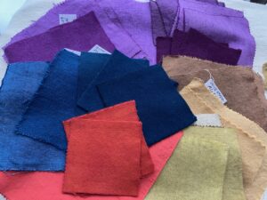 栽培したニホンアカネ Rubia akane の生根と岩手のムラサキLithospermum erythrorhizenの生根をそれぞれ使い、絹地を紫色と茜色に染め、延喜式にある深い赤色「深緋」をイメージしてアカネとムラサキを重ね染めした。紬糸を染めて服地や着尺に使う予定。