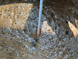 すくも藍を灰汁で仕込み、小麦麩を添加。3日目、発酵確認:液面で酸化したインジゴの膜Sukumo indigo is prepared with lye, wheat bran is added, and the mixture is stirred. On the third day, fermentation is confirmed: a film of oxidized indigo forms on the surface of the fluid.