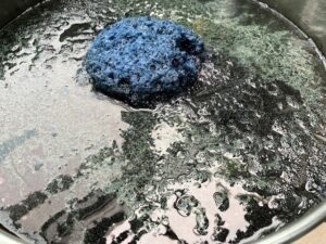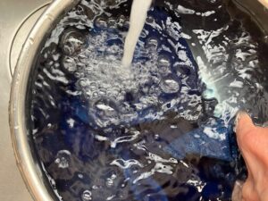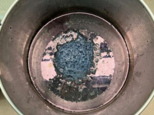 仕込んだ発酵液に灰汁を加えて45Lに嵩上げ。毛、絹、苧麻、綿を藍染ー酸化を繰り返す。Add lye to the fermented liquid to bring the volume up to 45L. Wool, silk, ramie, and cotton are dyed with indigo and the oxidation is repeated.