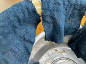 正面から光をあてると、微生物の活性で染色した濃度が高いウォードすくも+インド藍靛建液で染めた楮作品は、反射して紫色がかった藍色に見える。